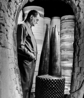 Axel Salto looking at the sculpture The Core of Power in the kiln, 1956 CLAY - Royal